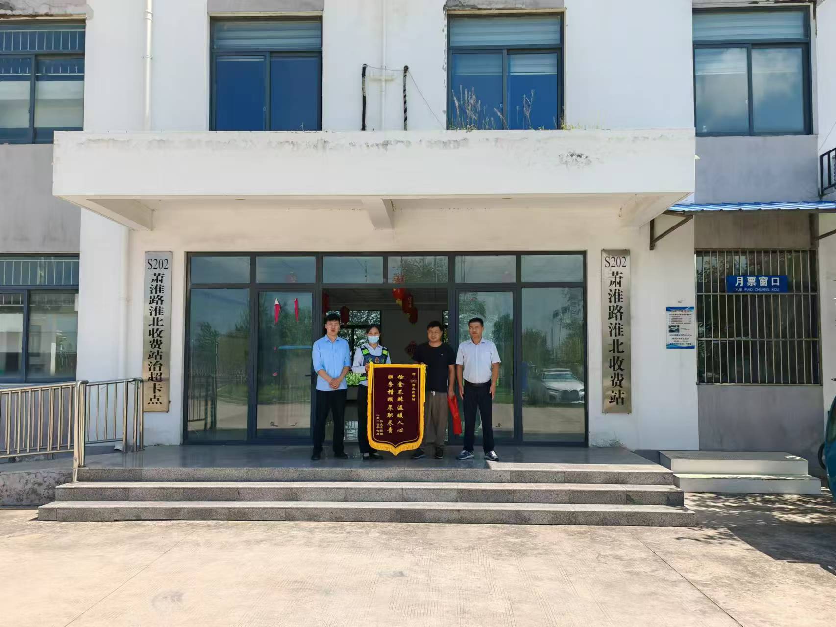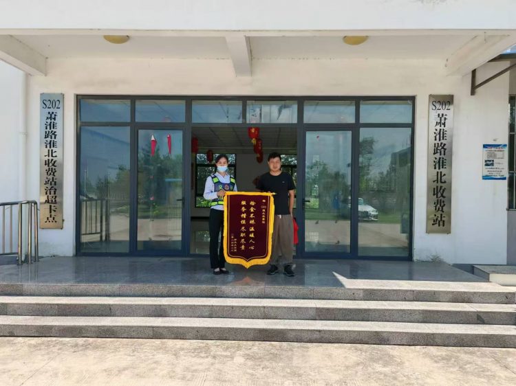 “真的謝謝你們,沒接到你們電話之前,我已經(jīng)和家里的人找了好久了,一直不知道掉哪里了。感謝你們拾金不昧、樂于助人,送上小小錦旗,聊表謝意!”7月25日,在S202淮北收費站,失主孫先生送上錦旗一個勁地向工作人員道謝。