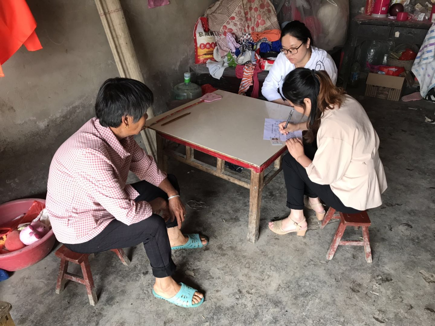 圖為:商貿(mào)公司幫扶小組現(xiàn)場了解幫扶對(duì)象各項(xiàng)信息。